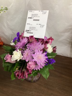 I was thoroughly delighted with the gorgeous flower arrangement that I recently received. The flowers were fresh and beautiful and in my favorite colors. Thank you!!!!