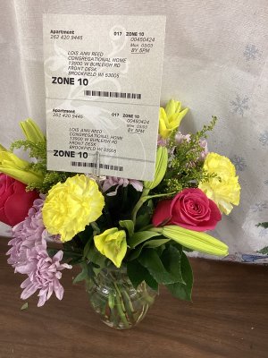 The flowers were very pretty- no complaint there; however, they were delivered to the wrong house and my neighbor had to bring them over. Not sure what the confusion was there. My neighbor said the delivery person claimed I wasn't home at the time they went to deliver, but I was home and no one came to the door or rang the doorbell. I would've preferred a call if there was any confusion. Thank you!