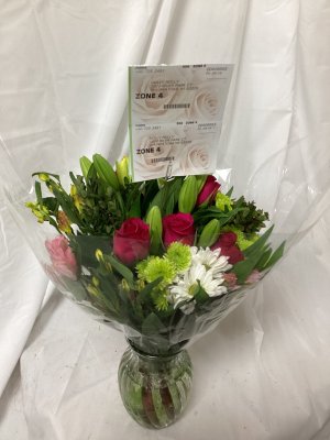 Flowers were beautiful, but too tightly oacked together and the vase was too high in proportion to the bouquet.