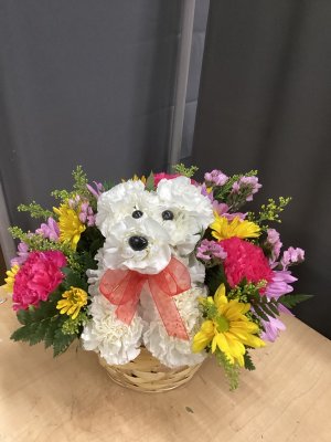Unfortunately mine didn't look like the photo - no statement flower in the front as pictured - the site says it may look different depending on flower availability. I would think there was some type of colorful flower that could have been put in the arrangement - it's a wood container with a bunch of white flowers and a few green sprigs. The flowers are beautiful - very serene and could pass for an arrangement prepared for a funeral.