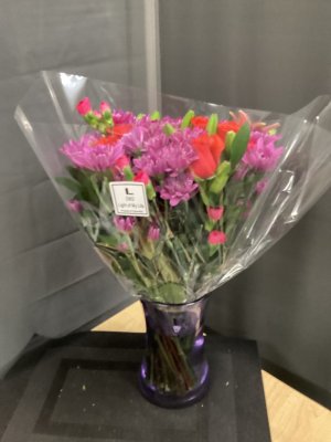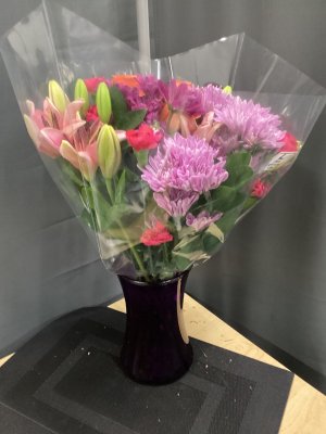 When delivered the flowers were only protected from severe cold by plastic, they were cold, very little water in them and severely wilted. Very disappointed!!!