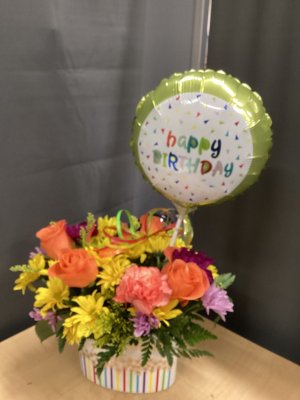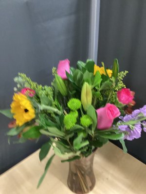 Arrangement was brightly colored with mixed varieties of flowers.