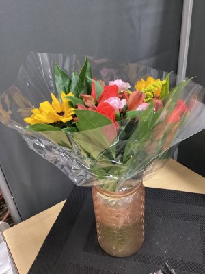 The flowers are absolutely beautiful. It could have had a peach or yellow ribbon around the jar to make it look more festive. It is fall now. And I'm sure what my friends paid a little bit more wouldn't hurt. To my friends it is absolutely appreciated.