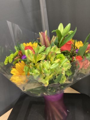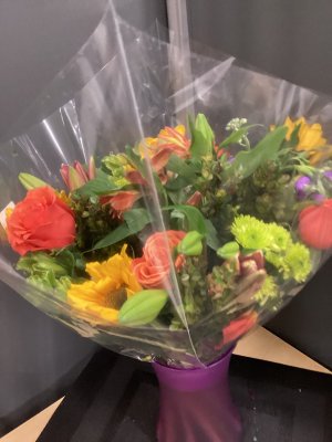 The only reason I didn't give 5 stars was the orange flowers were wilting. Otherwise beautiful arrangement!