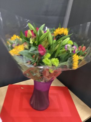 Flowers were pretty, but should have been put in a bigger vase then they wouldn't have been smooshed up in the vase they were put in.