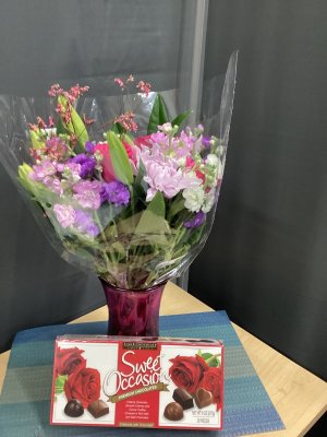 The flowers are beautiful with nicely coordinated colors. The vase was too narrow so I transferred them to a wider vase.