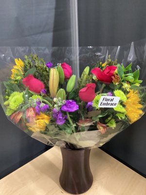 The arrangement is absolutely beautiful! I love the color combinations! My only complaint is I think the vase must have tipped over in the delivery truck because when I cut through the outer wrapping, a ton of water dumped out onto my counter and floor and there was barely any water in the vase. And it is very hot right now and I think the flowers were exposed to the heat en route and with little water for them, they now have that kind of rotten odor that flowers get when they are getting old. This circumstance was unusual, I am sure, due to the weather and a mishap with them falling over in the van. Otherwise the arrangement is absolutely gorgeous and the flowers are high quality.