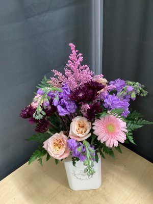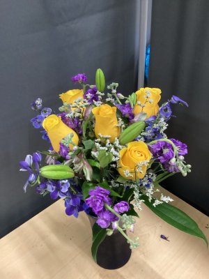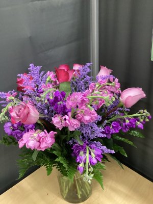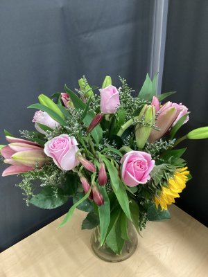 Absolutely beautiful!! Arranged wonderfully and in a pretty vase. Great job!