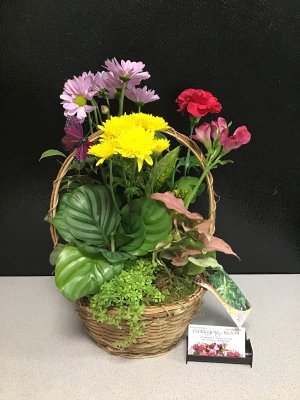 Love the purple& white plant and the white&green plant unfolding in the back like a butterfly. The balloon is perfect. Only suggestion for next time I order woul be a medium greyish colored bowl & maybe a tiny viola at front of bowl. I think my Mom will be surprised& delighted! Thank You.