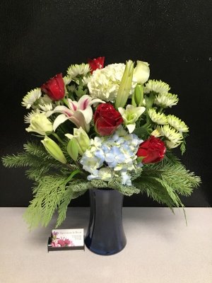 It was nice to get the photo from the shop so I didn't have to ask the recipient for one. The arrangement was very nice, and the recipient said that the flowers were beautiful, so that was good. My only disappointment was that I had stated while ordering that the recipient's favorite colors were red and blue, and As this was for a non-romantic friend, I didn't want red roses. I'm also not a fan of the large green flowers, as I think it lowers the ‘pop' effect. But, again, the recipient was pleased, so thanks for that.