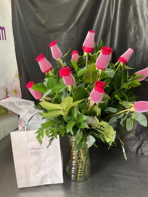 The flowers that were sent and got there rather quickly, which I appreciate we're very beautiful. The colors of the roses lavender and hot pink or just outstanding and the arrangement was beautiful. Definitely would not hesitate to use the florist again.