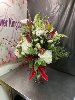 The flowers were beautiful and my friend loved them. They looked beautiful on her table for Christmas dinner. Thank you Flower Kingdom for a beautiful arrangement.