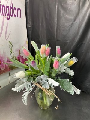 Beautiful tulip arrangement, one of my wife's favorite flowers. Flower Kingdom is the only florist I use. They are professional, courteous, friendly, and always accommodating, even at the last moment.