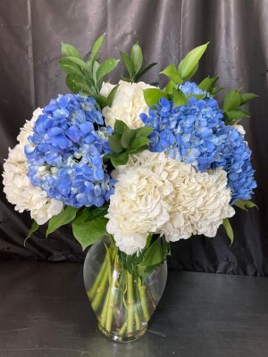 Thank you for sending a picture. I know I asked for all blue hydrangeas. I asked that it convey a sea of blue. Perhaps a blue ribbon would have helped to hide the stems. The unevenness of them is distracting. The message was attached where? Thank you for delivering in a timely manner.