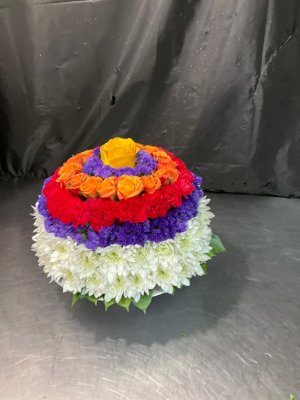 Disappointed. The actual flowers pictured do not represent the idea of a cake as well as in your catalog. And the catalog picture is much neater and symmetrical.