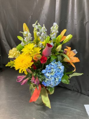 Beautiful arrangement! I keep coming back because Flower Kingdom is local and the flowers are always fresh so they last a long time. This particular one is called Pretty Paradise. It's beautiful and large but one-sided so it needs to be displayed against a wall or something. Ours is on a credenza and looks quite lovely there!