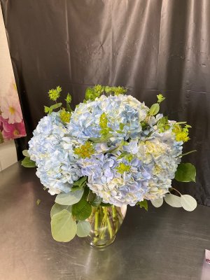 Thank you for sending a picture. I know I asked for all blue hydrangeas. I asked that it convey a sea of blue. Perhaps a blue ribbon would have helped to hide the stems. The unevenness of them is distracting. The message was attached where? Thank you for delivering in a timely manner.