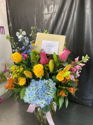 Absolutely gorgeous arrangement, pricey buy worth to money! Quick same day delivery and friendly drop off! I've used them several times before and have always been great! She loved it!! Thank you Flower Kingdom