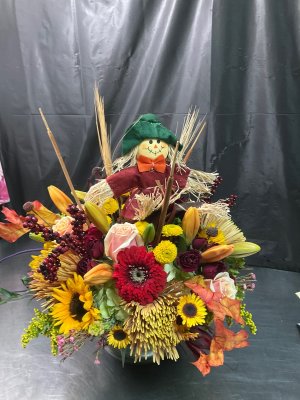 Thank you for sending a picture. I'm not happy with this arrangement. It doesn't feel balanced. Please take out the scarecrow and the tall wispy brown pieces. Is there anything else you can do? I'd like to talk to someone before this gets sent. My number is +19147721135