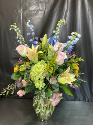 A stunning arrangement that truly reflects her beautiful spirit. Thank you for the care put into every bloom.