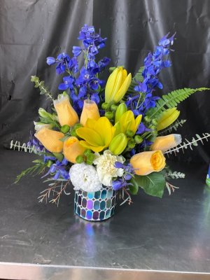 Beautiful arrangement. My husband loved the bright, beautiful flowers he saw daily in Fl. We asked for an arrangement of flowers typical of Florida. Perfect.