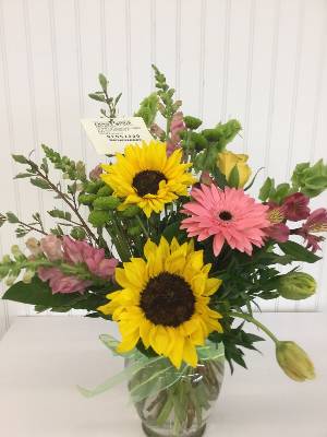 Loved the card that was sent with the flowers and the delivery time was also great. The arrangement was ok but the colors used didn't make the arrangement as nice as I thought it would be. I asked for a country arrangement, sunflowers, wildflowers etc...