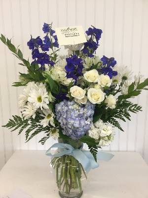 I appreciate the promptness in getting this done, but the Hydrangeas were not dark blue, as I was told they would be. So, they didn't match the rest of the flowers. Thanks again, though.