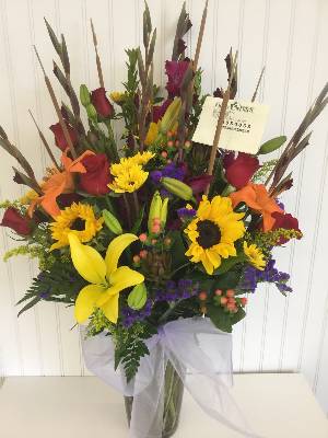 Sunflowers are smaller than pictured on the website. A number of flowers have not opened yet. The bow is just ok. Not as impressive as other arrangements I've ordered for the same price at $200.