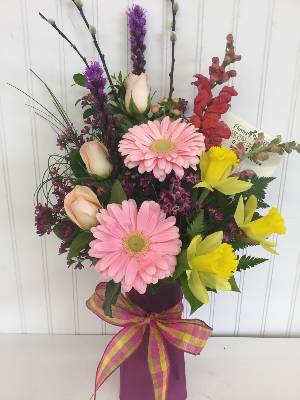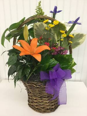 The balance of the arrangement looks a lot better and the bow. Would have liked to have seen the purple flower stem accent added to the basket as shown online. Thank you for your promptness and letting me review the order.