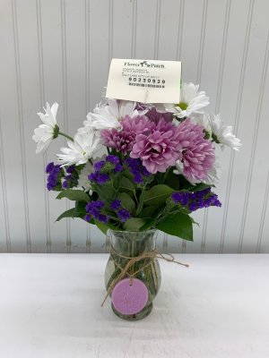 I liked the arrangement on your website better. There were more purple flowers throughout on the website. It looks like you reversed the color scheme. I dont care for the green disc since the arrangement is purple. I expected the purple disc.