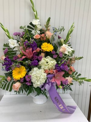Oh, this arrangement is so beautiful and so perfect. Thank you so much for helping us say goodbye to our aunt. My father would have been so grateful to the honor done his sister. 🙂
