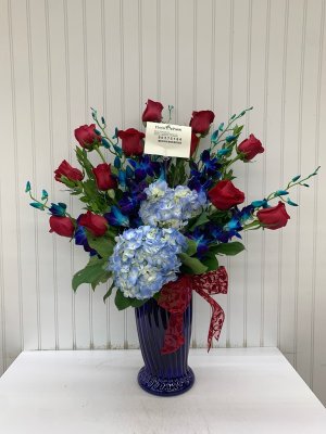 Beautiful floral arrangement was delivered on time and just as pictured on the website. Customer service was very helpful with a last minute change.