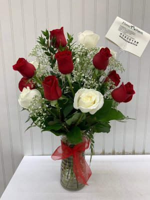 Thanks for the photo - I love being able to see what it looks like. The green leaves are a bit heavy and distracting from the flowers, especially the top half - having only a description and not discussing it with me in person you did alright. The roses had puffed out and made the arrangement beautiful by the time the funeral started. Thank you