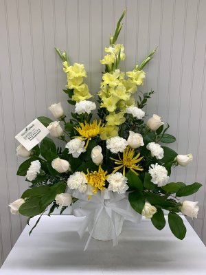 Thanks for the photo - I love being able to see what it looks like. The green leaves are a bit heavy and distracting from the flowers, especially the top half - having only a description and not discussing it with me in person you did alright. The roses had puffed out and made the arrangement beautiful by the time the funeral started. Thank you