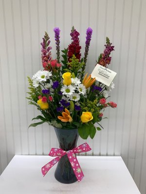 Thank you, the arrangement looks just like the photograph online. The flowers were fresh, the colors are vibrant, and they arrived on time to the church before the funeral started.