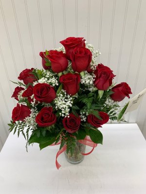 Those roses look like they're already bloomed. Aren't they supposed to be closed so in a couple of days they open up I understood it was gonna have a blue ribbon. I don't know how the blue ribbon would look with that red because he was in the military I'll ask my sister what she thinks. Can you take a picture without the card? There doesn't really show how the arrangement looks with that card. It doesn't look like there's enough flowers. I know this is all we paid for, but it seems to empty. I don't know maybe the green filler there's not enough. It is really pretty