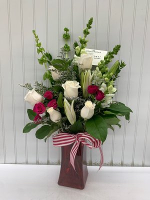 The flowers are stunningly beautiful. Thanks for your gorgeous design and prompt, efficient delivery! And thanks for the photo! My girlfriend said to your delivery guy, what am I going to do with this guy? He keeps sending me flowers! He said, “Don't marry him—because then the flowers will stop!” She laughed. But in my case, they will not!