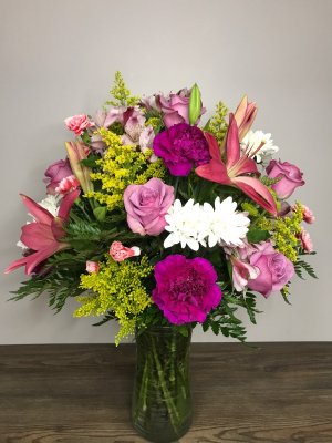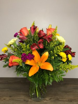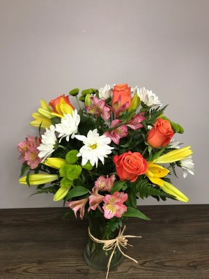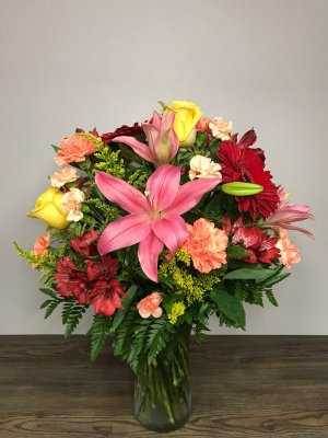 Beautiful, ordered a large arrangement and that is exactly what I got. This will be even more beautiful once all the Lillies open. Thank you for doing such a great job and making such a beautiful arrangement for my mother in law.