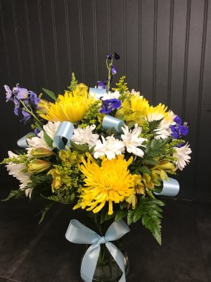 This is not what the arrangement looked like online, nor what we spoke about on the phone. I was told the purple would be darker but not that there would be yellow roses. Definitely disappointing