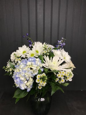 Beautiful! This is one of my favorite arrangements that I order often. Love the white flowers with the pretty blue vase. Thank you Flower Power! :)