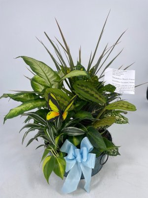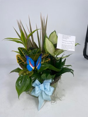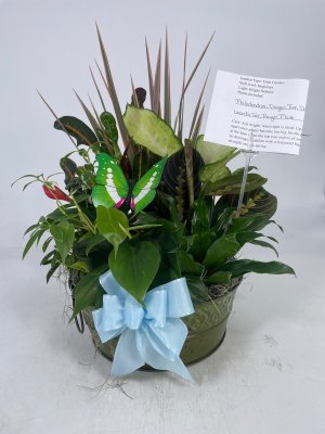 Dish garden was received in great shape! The monarch was added after this pic and the plant descriptions and care sheet were really appreciated by my friend! Thanks for always delivering a great product!