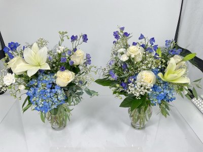 Love the vase and arrangement. Thought the roses would be changed out to blue. That's ok if you didn't have. Thank you