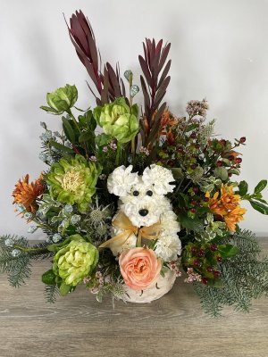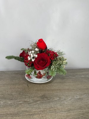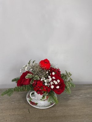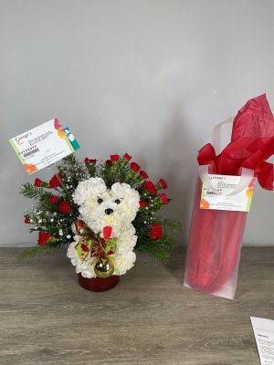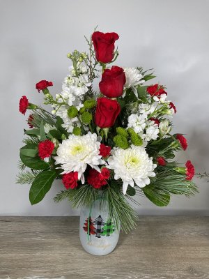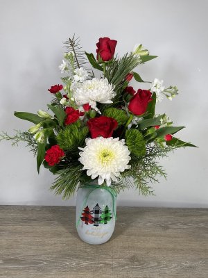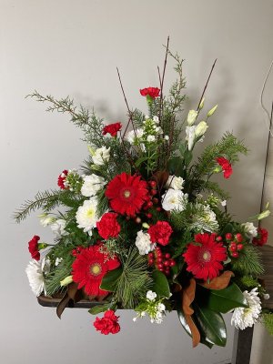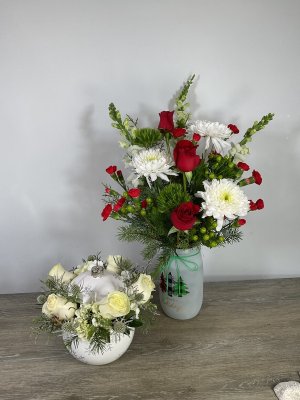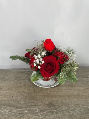 This is an all-around arrangement with two full size roses, one is in the back. Normally there would be 2 stems of miniature roses, but they had to be substituted for berries of equal ... More