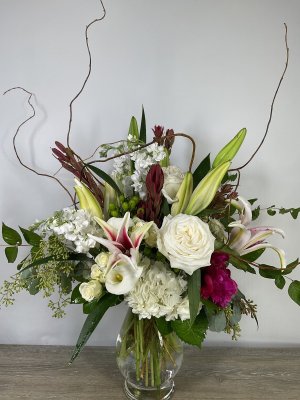 The arrangement is absolutely beautiful!! They were able to customize it and executed it better than I could've imagined. I loved being able to see a photo before having it delivered. Thank you so much, I will definitely recommend George's Flowers to anyone needing a special arrangement.