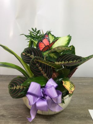 Plant looked healthy-wish it would have had a flower blooming-bow was ok a little brighter would have been better. Liked the basket. Thank you.