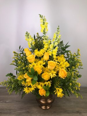 it does not resemble the brightness of the one we discussed on the website. is the photo after delivery? either way it is so nice to get the photo. i was so impressed with the help i received on the phone when discussing the order. thank you George's Flowers.