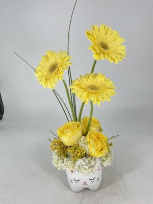 Love this fun arrangement! Purrfect keepsake container with bright flowers. Thank you!! 💜🧡