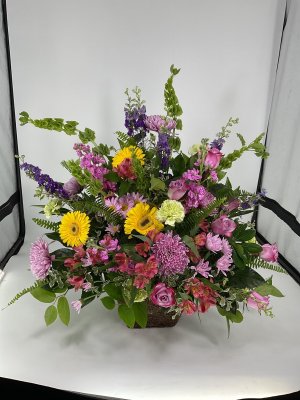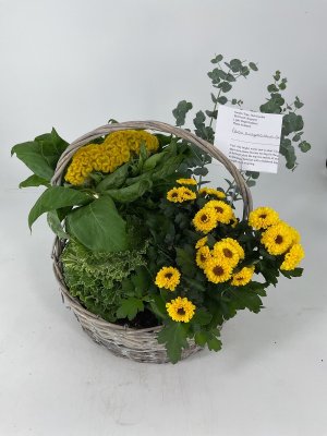 This is a lovely arrangement! The recipient appreciated being able to plant the flowers in his garden in memory of his loved one.