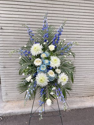 The arrangement looks beautiful and appropriate for the situation. It's also so nice to get a photo, as I am out of town and won't see it in person. Of course. Website pictures look beautiful, but it's nice to get confirmation of how it looks once your order is actually filled. George's did a great job and I recommend them.
