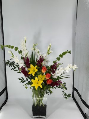 The online service and communication were wonderful. The flower arrangement was beautiful and as expected in size and colors and dynamics. I love the added service of sending a picture of the flower arrangement when completed. Thank you, George's Flowers.